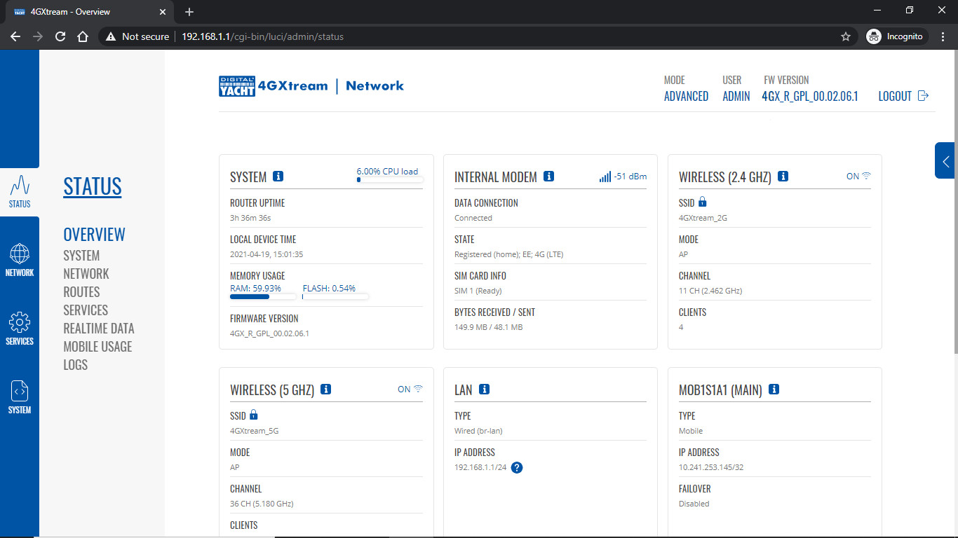 Voor externe krachtige wifi (om toegang te krijgen tot hotspots aan wal) wordt onze wifi-boosterantenne aanbevolen, die wordt aangesloten op de WAN-poort. 4G Xtream kan dan fungeren als router voor deze verbinding en stelt de gebruiker in staat om te schakelen tussen wifi en LTE.De configuratie is zeer eenvoudig. Plaats simpelweg de SIM-kaarten. 4G Xtream heeft twee standaard SIM-slots, zodat u twee SIM’s van verschillende netwerkoperators kunt gebruiken. Standaard leest 4G Xtream de geplaatste SIM uit en selecteert automatisch de juiste APN-instellingen uit zijn interne database.