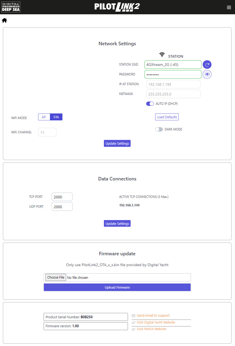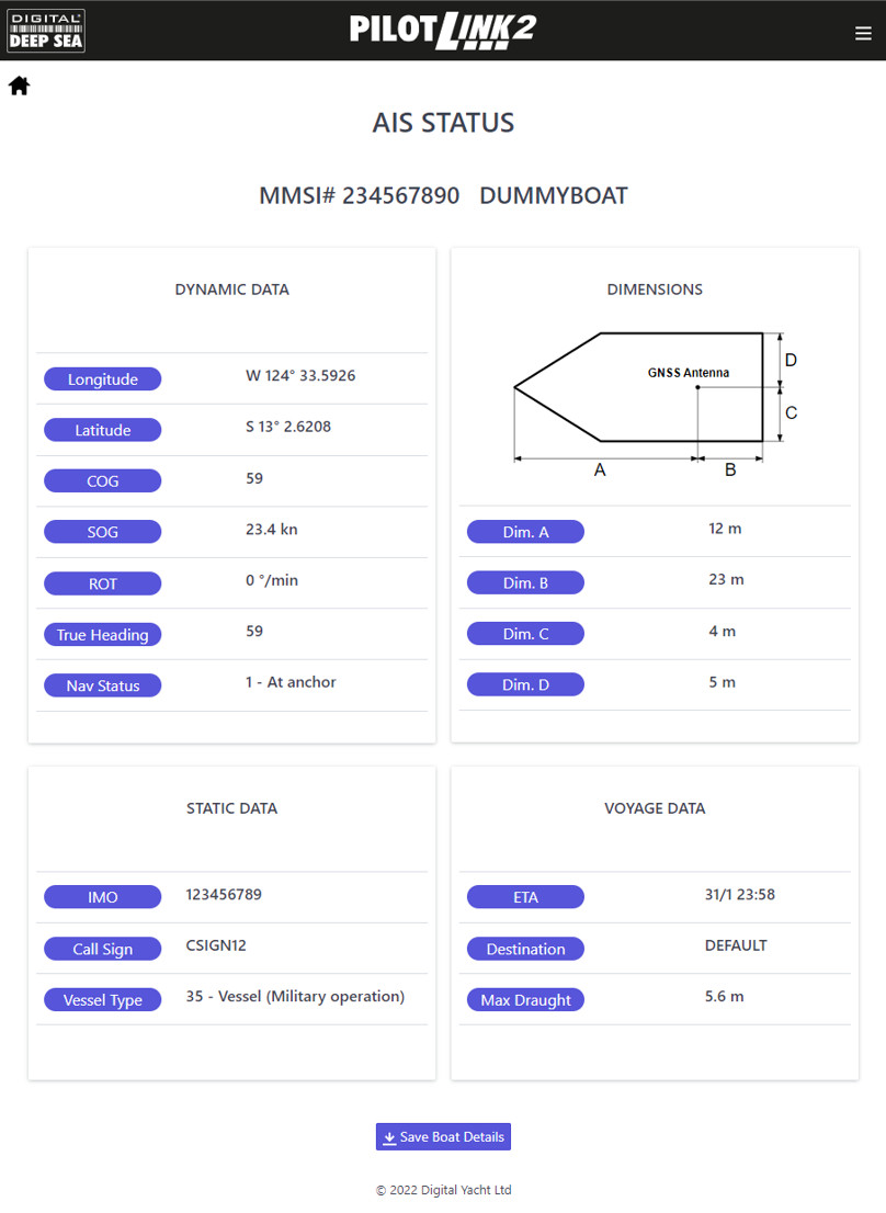 De setup van PilotLINK2 is eenvoudig via de lokale webinterface in de browser van je mobiele device. Je kunt de standaard netwerknaam en het wachtwoord wijzigen, GPS-, heading- en rate-of-turn data bekijken, of de Static en Voyage data controleren die in de transponder is geprogrammeerd. Je kunt zelfs de ruwe NMEA 0183 data bekijken die uit de transponder komt en dit loggen naar een tekstbestand op je mobiele device voor analyse aan wal.
