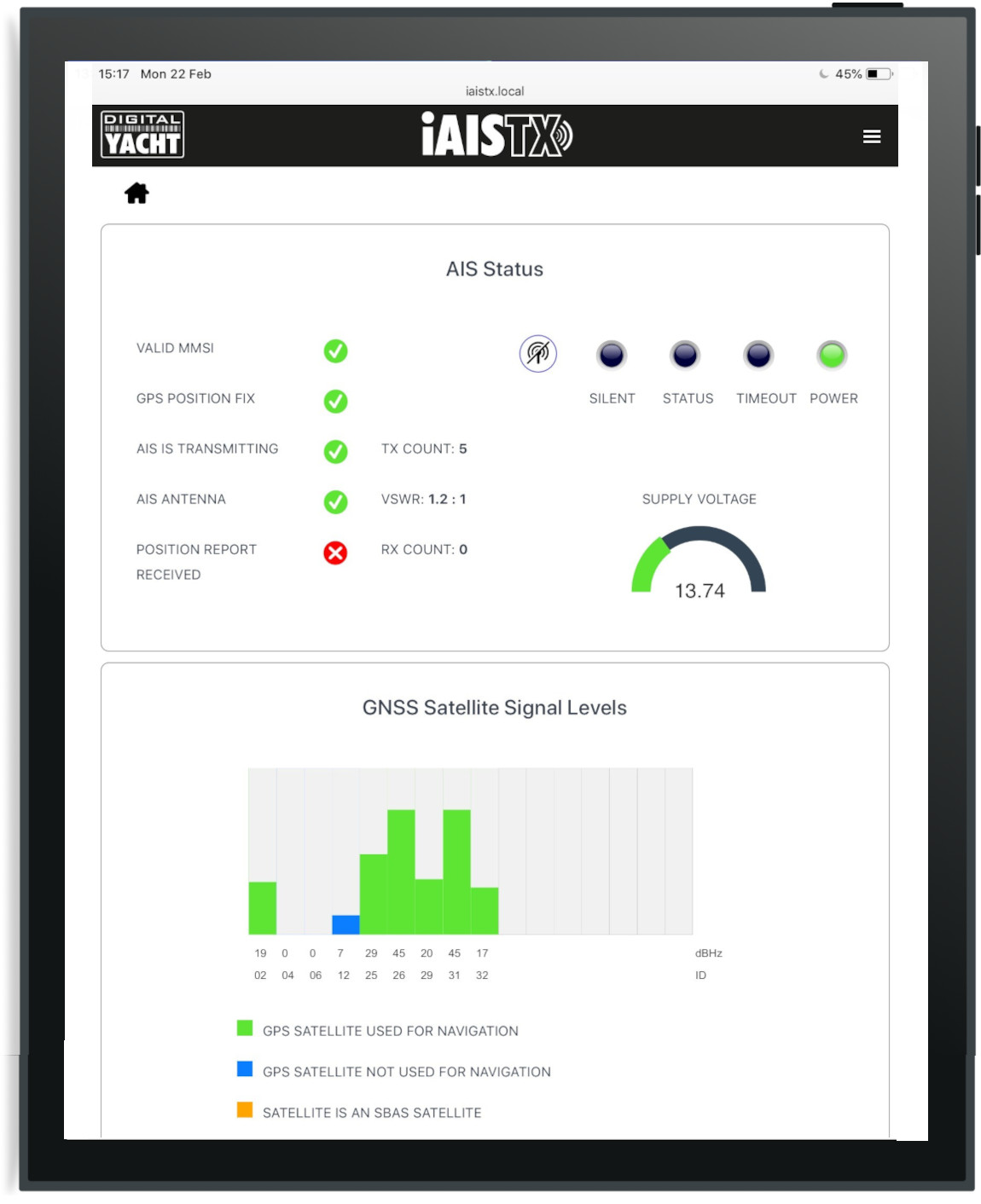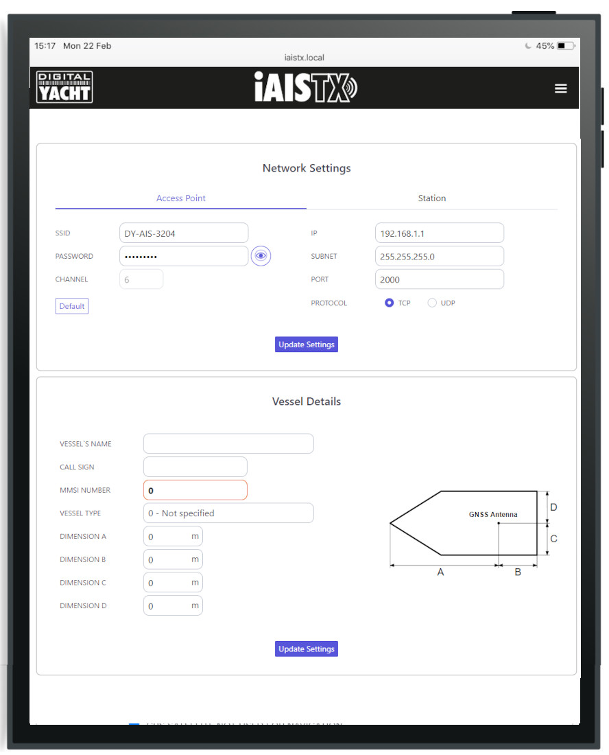 U kunt de iAISTX configureren via de eenvoudige, ingebouwde webinterface: open gewoon uw webbrowser, voer het IP-adres van de iAISTX in en u kunt de scheepsgegevens (MMSI-nummer, scheepsnaam, enz.), netwerknaam, wachtwoord en zelfs het samenvoegen van het AIS-wifi-netwerk met een bestaand wifi-netwerk aan boord instellen. Er is dus geen ingewikkelde programmeersoftware of app nodig. U kunt in de webbrowser zelfs de ontvangen NMEA-data bekijken voor eenvoudige foutdiagnose.