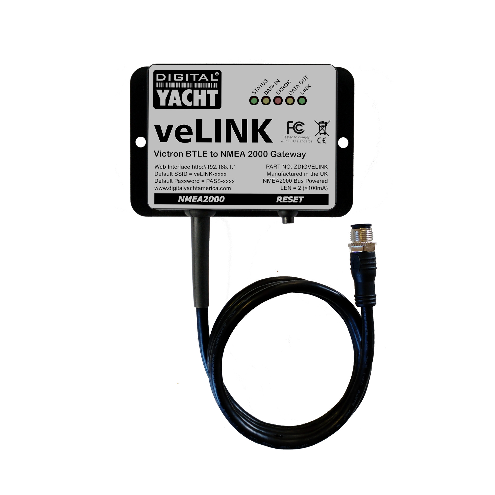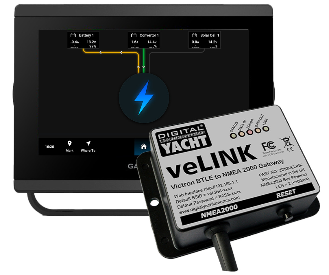 veLink maakt het mogelijk om essentiële data van Victron batterijmonitoren (SmartShunt, BMV, enz.) te tonen op multifunction displays en kaartplotters die op NMEA 2000 zijn aangesloten: stroomverbruik, accuspanning, status van service- en startaccu, plus resterende autonomie/SOC (laadstatus) op de plotter.veLink geeft ook informatie van een compatibele walstroomlader, zodat je de laadstroom naar de accu’s nauwkeurig kunt volgen. Zo’n lader zit vaak op een lastig bereikbare plek; met deze draadloze oplossing wordt monitoring een stuk makkelijker.